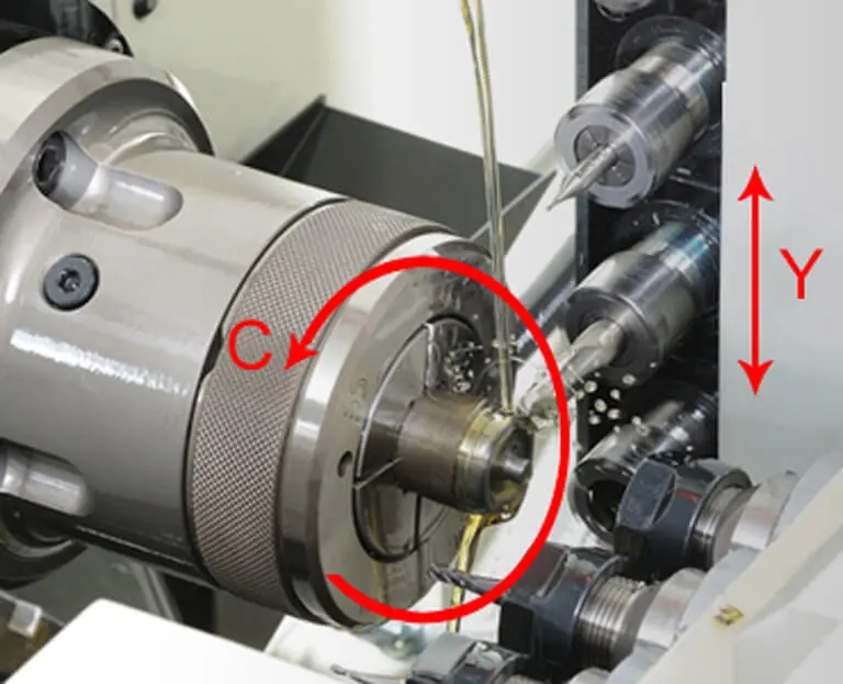 The C-axis of the main spindle, in conjunction with the Y-axis driven tools and end milling cutters, enables this machine to perform milling, drilling, and tapping operations. Utilizing the C-axis function, complex part machining changes are quick and easy.